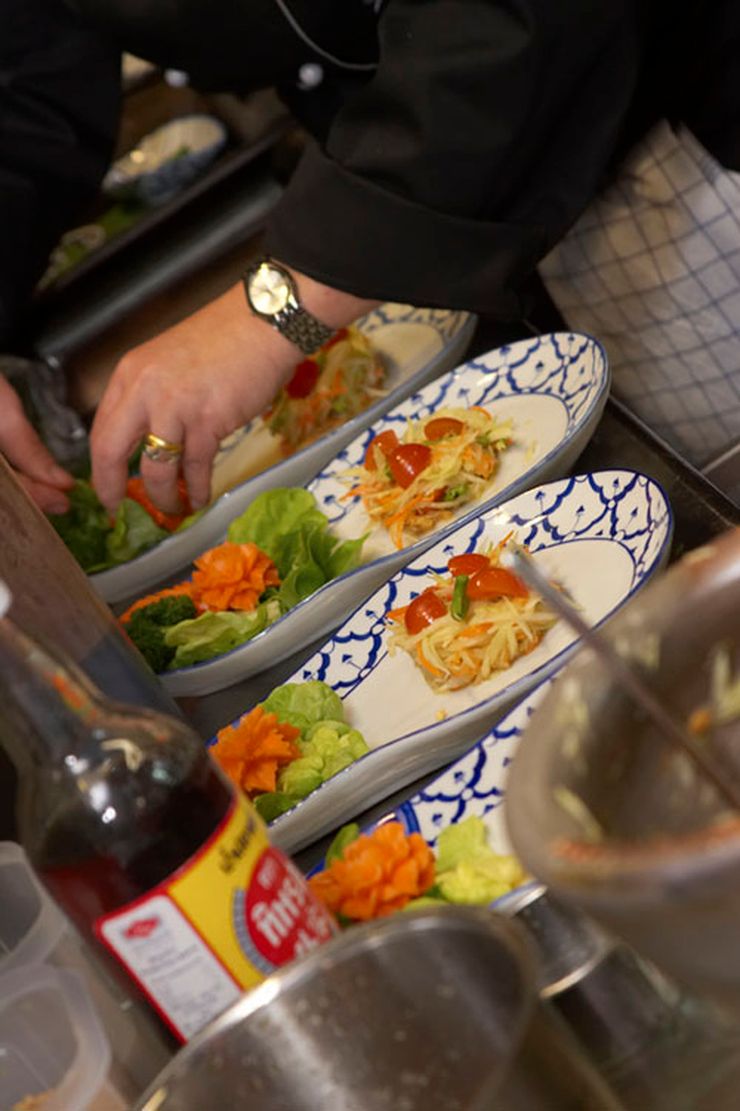 Narai Thai serveert gerechten uit de vier hoofdregio’s van Thailand, bereid met frisse kruiden zoals koriander, limoenblad, gember en citroengras. Denk aan klassieke Thaise curries, wokgerechten met basilicum en chilisaus, vis- en vleesopties, vegetarische varianten en fine-dining suggesties. De sfeer is exotisch en stijlvol, met aandacht voor detail.